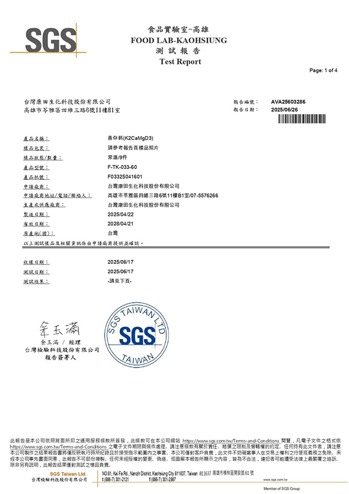 | 注意事項 | 1. 衛福部TFDA法規:每日食用量中,鎂總含量不得高於600毫克(本品每份含:55毫克) 2. 衛福部TFDA法規:每日食用量中,維生素K3總含量不得高於500微克(本品不含維生素K3) 3.本品維生素K2每份含:240微克 4.本品為一般食品,非藥品,因個人體質不同,使用後如有任何不適,請立即停用並諮詢醫師、藥師或營養師。 |