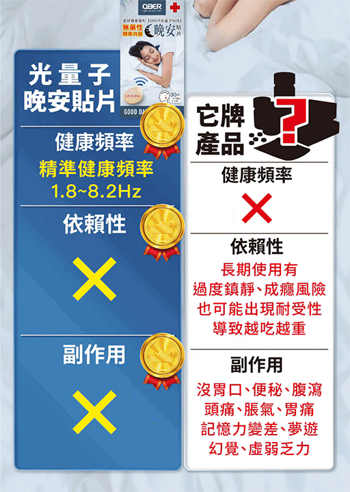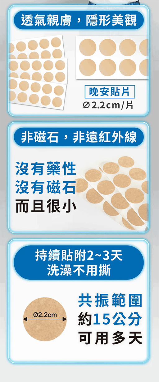 ➤ 榮獲國家專利-QBER光量子科技 ➤ 精準1.8~8.2Hz頻率持續共振 ➤ 不含藥性,一片可貼2~3天,洗澡不需要撕除! ➤ 與魔法貼同樣擁有1.8~8.2Hz頻率,差異是另外加強了「睡眠」的頻率 ➤ 貼附後白天並不會嗜睡,請安心使用 ➤ 內附使用說明書貼法教學 ➤ 貼了多日後,若有搔癢感請盡快撕除! 避免過敏不適。