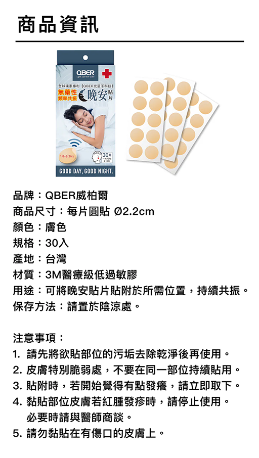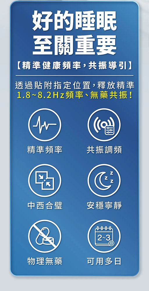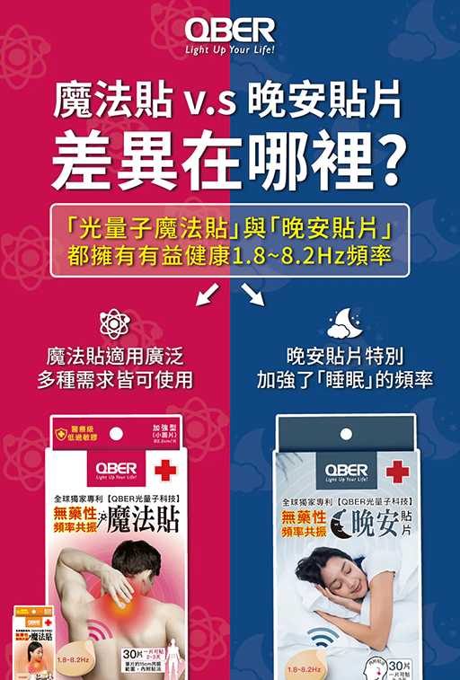 ➤ 榮獲國家專利-QBER光量子科技 ➤ 精準1.8~8.2Hz頻率持續共振 ➤ 不含藥性,一片可貼2~3天,洗澡不需要撕除! ➤ 與魔法貼同樣擁有1.8~8.2Hz頻率,差異是另外加強了「睡眠」的頻率 ➤ 貼附後白天並不會嗜睡,請安心使用 ➤ 內附使用說明書貼法教學 ➤ 貼了多日後,若有搔癢感請盡快撕除! 避免過敏不適。